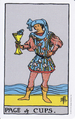 蓮の花?が勢いよく何本も咲いている柄の着衣。頭にかぶっている帽子は水しぶきをイメージしているのだろうか。手に持つカップからは魚が一匹「こんにちは!」と言いたげにこのペイジと目と目が合っている。長年追いかけていた遠い存在だと思っていたものが今自分の身近に存在することに気づく。
