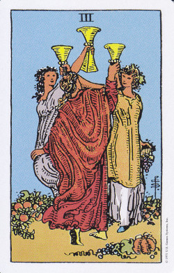 カップを高々と上げ、この喜びを天空の神に感謝し、乙女が3人祝杯を挙げている。「乾杯!」「ようやくひと区切りついたわね。」「努力した甲斐があったわ。」「今日は夜中まで飲み明かすわよ。」「大丈夫かしら?ぬか喜びに終わらなければいいけど….」