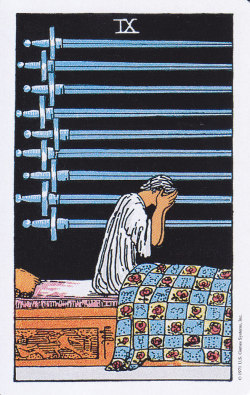 漆黒の闇。壁に突き刺さる剣が9本。クイーンの心の内を表している。剣の階段を駆け上がり、駆け下りる。もう数えきれないほどこの鋭利な剣の階段を行き来した。鉄の心を擦り減らすほどに考え尽くした。「キングの夢をみた。」「これはいったい何を意味するのか。」暗闇から手を差し伸べるものはいない。明ける事がない孤独の闇。心に突き刺さった剣が抜ける日は来るのでしょうか。