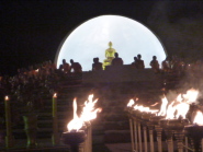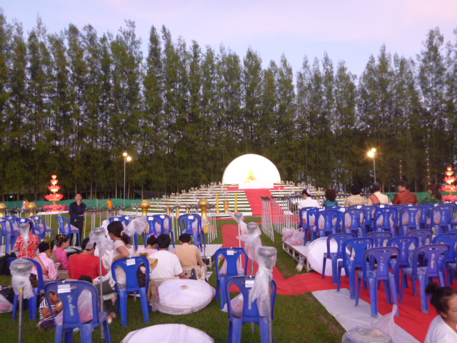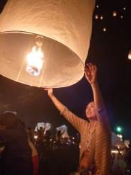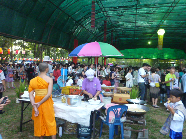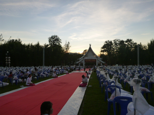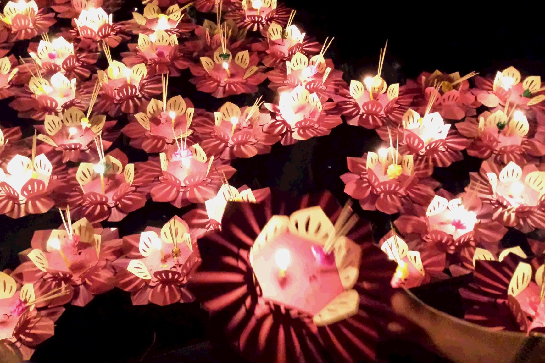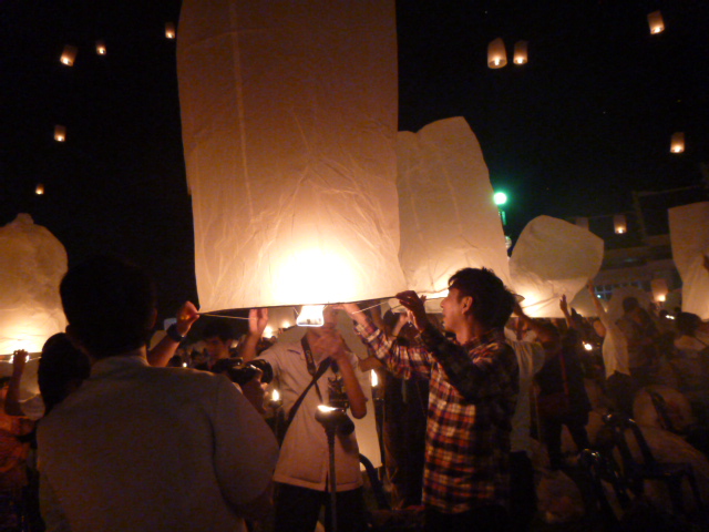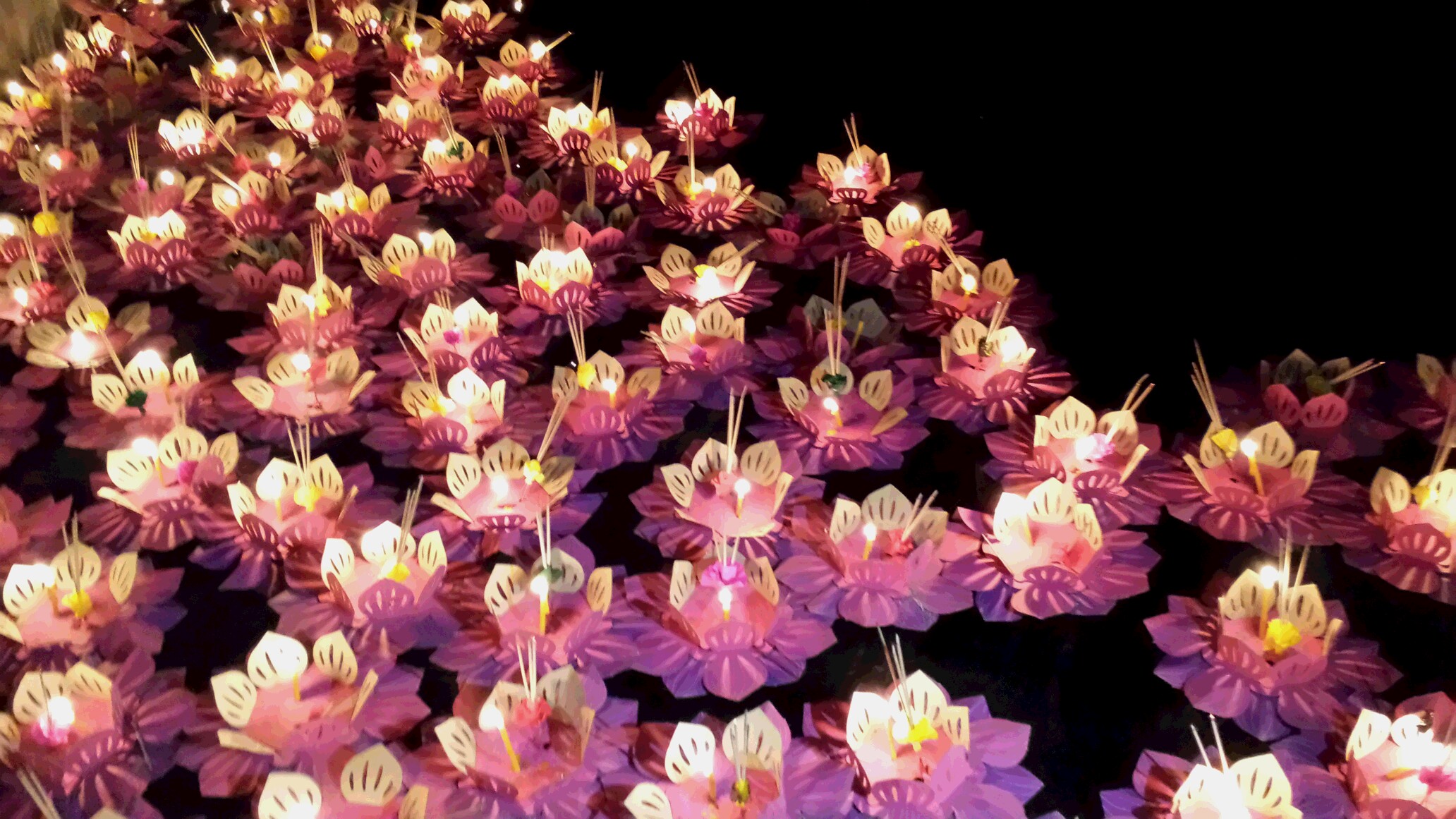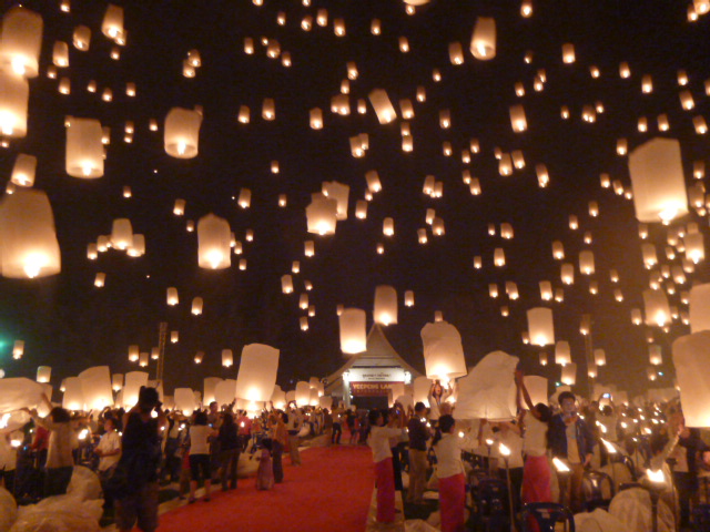 毎年11月の満月のころタイでは神に感謝の念と己の穢れを清めるためにローイクラトン、灯篭を川に流します。チェンマイではコムローイ(雪洞ぼんぼり)を空に放ち厄払いをするイーペン祭りをローイクラトンの時期に行っています。今回初めての体験でした。入場時一人一人にお土産としてストールが配られ、会場内で歌や踊りがあり、ペットボトルの水やお菓子などが配られます。飲食する場所から少し離れた所にコムローイをあげる特設会場があり、全て指定席になっています。あたりが暗くなるとイベントの説明があります。日本語、中国語、英語でも流れました。入場門からレッドカーペットの上を僧たちが歩いてきます。火が灯され、僧のお話、お経を聞き、瞑想し、魂を浄化し、コムローイへの点火という流れです。幻想的な光景が目に焼き付いた後は蓮の花を形取った灯篭に立てられた御線香に火をつけ水に浮かべに行きます♡