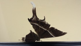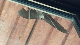 あれ、窓に大きなゴミがへばり付いているう!?。でも近づいてよく見ると、なんとそれは大きな蛾でした。えっ?でも形がおかしいんじゃない。羽の形がシンメトリーじゃない。片方の羽が半分くらいちぎれている。頭を下に向け必死に窓枠に張り付いている。こんな酷い体でマンションの9階まで飛んで来たのか。30分くらいたってから窓をみるとそこにはもうあの蛾の姿は無かった。ベランダにも落ちていない。また何処かへ飛んで行ったのか。そこへこんどは別の蛾が窓枠の上にとまっていた。やはり頭を下にして。今度の蛾は羽がちぎれていない。蛾と目が合う。ベランダのひさしのある場所は心地よいのかなあ♡