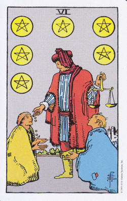 左手に天秤を持ち金貨を与えている。感情で天秤棒を傾かせない人。施す側と施される側。支払う側と受けとる側。仕事を与える側と受ける側。需要と供給。買い手と売り手。両者の立場は真逆である。お金で繋がる関係。損得を考える関係。天秤の様に人や物などをうまくはかれる人が商売上手なのでしょうか☆