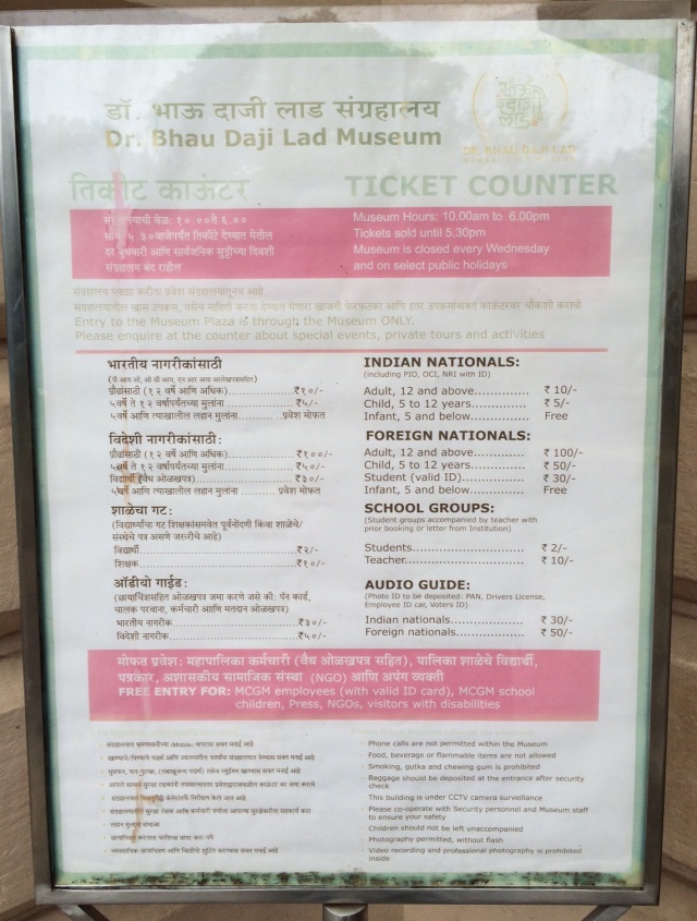ムンバイの博物館見学の第二弾はドクター・バウ・ダージ・ラッド博物館(旧ヴィクトリア&アルバート博物館)です。間口は狭いですが奥行きが広いです。石の展示、宝飾品、工芸品、象牙細工、細密画、星座図、「沈黙の塔」のレプリカなど綺麗なもの興味深いものがいっぱいあります。こちらはカメラ撮影は駄目ですが携帯電話での写真撮影はOKで無料でした。入館料は大人(Foreign Nationals)一人100ルピー(約170円)です。開館時間は10:00am~6:00pm、チケットの販売は5:30pmまで、水曜日と祝日は休みです。博物館の横には動物たちがいる庭園があり憩いの場所です。別途入園料がかかります。