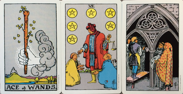 ① Ace of Wands(ワンドのエース)エネルギーを充分に溜めて上手く放出、使えば夢を実現できる。スタートをきれる。あるいは再生、復活できる。