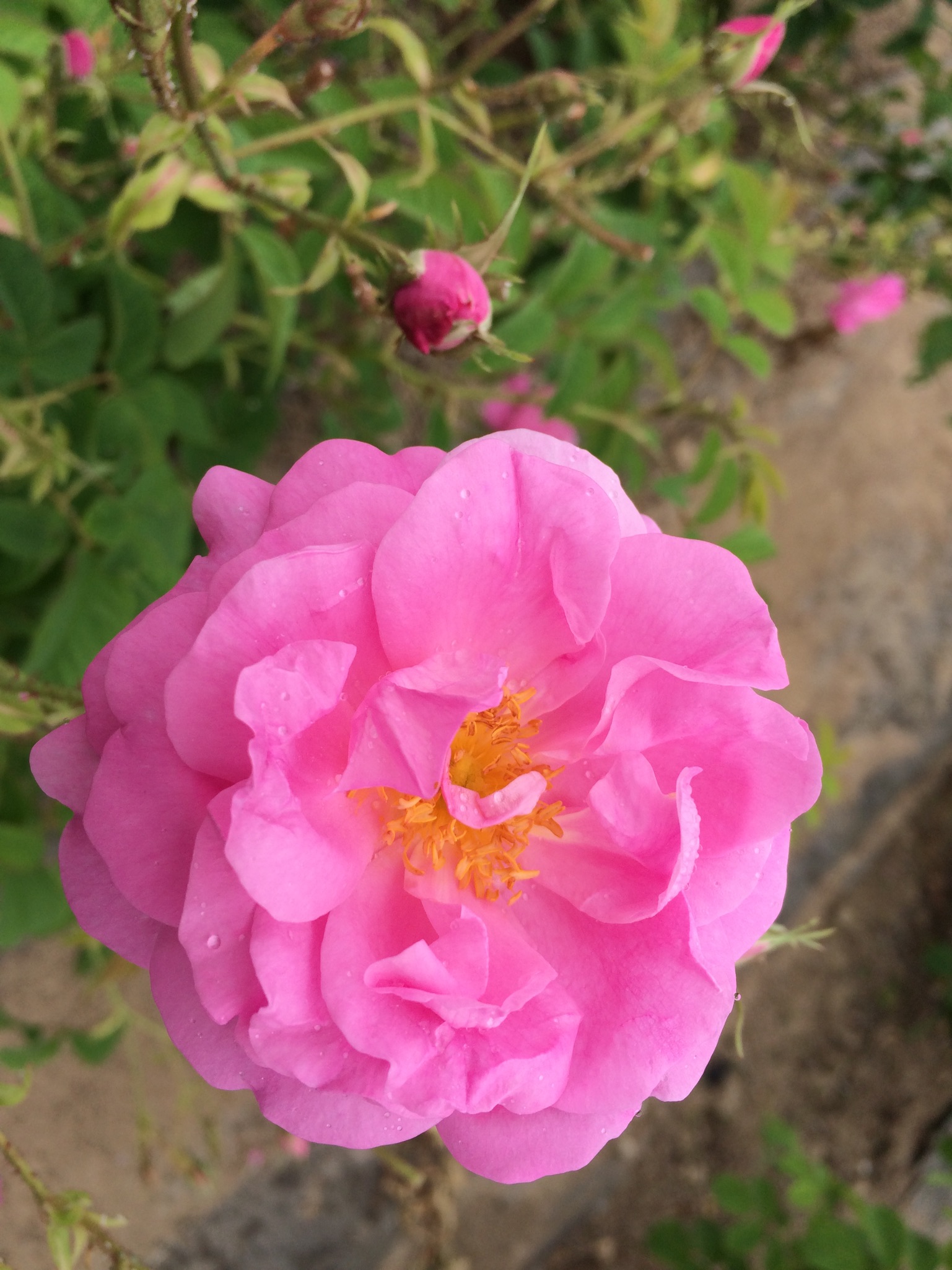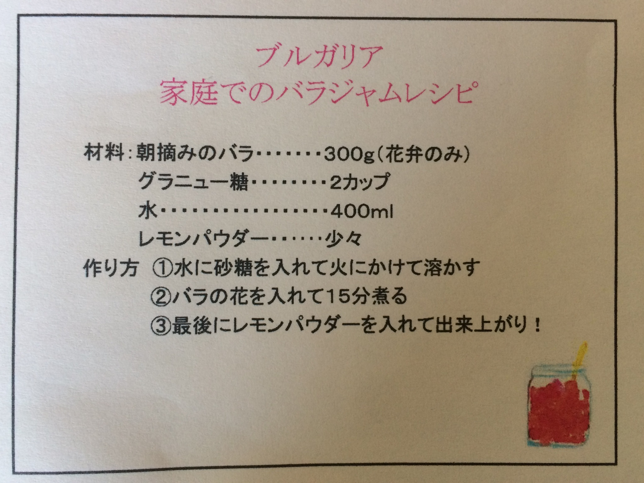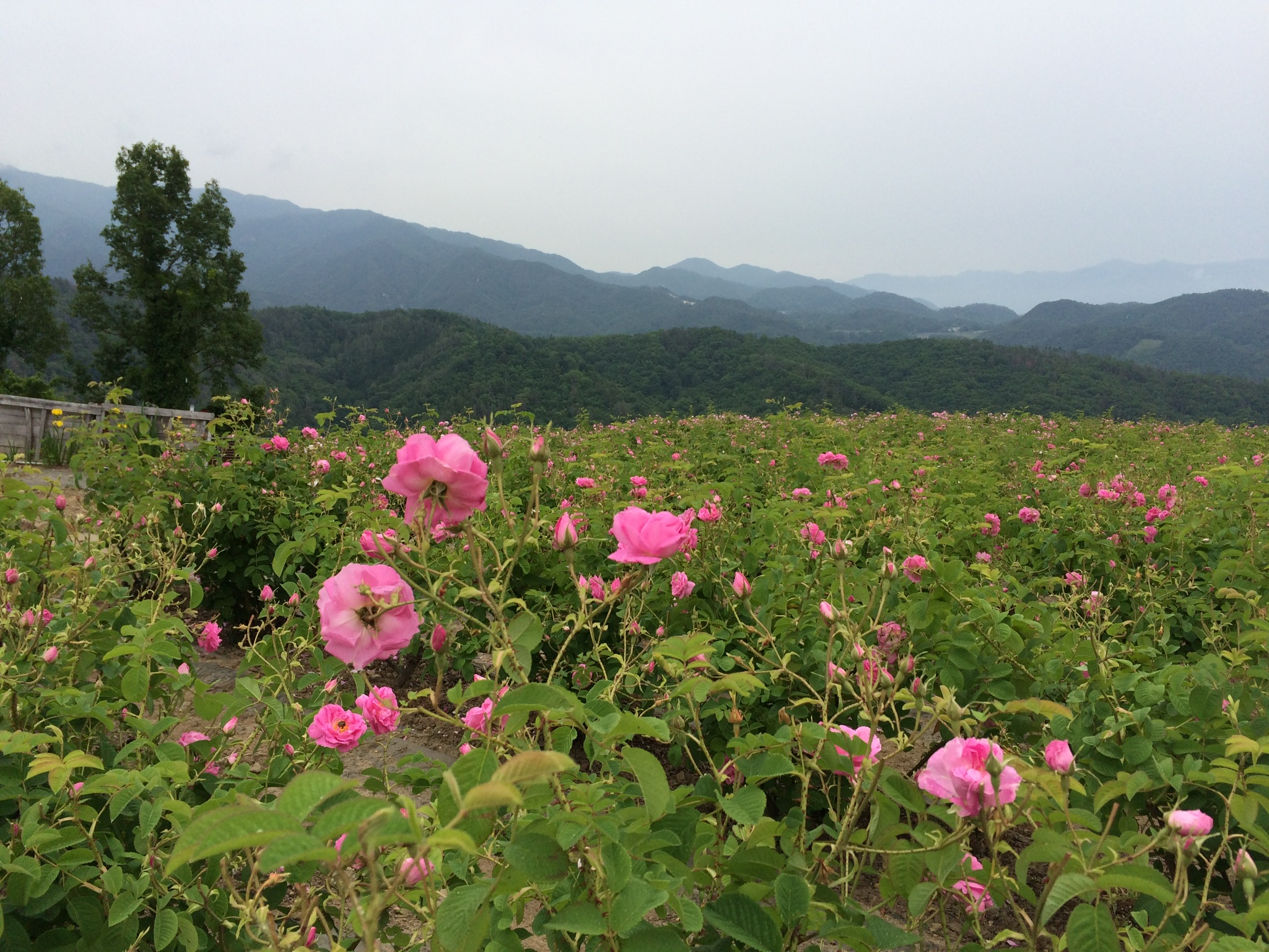 ダマスクローズの花摘みに行ってきました。場所は山梨の小高い丘の上です。お天気が良ければ富士山も見えます。この日は朝から曇りで雨がぽつぽつ降ってきました。しかしそんなことにはめげずに雨がっぱを着てひたすら摘み取りました。花の色が薄いのは咲いてから時間がたっているもの。濃いピンク色のものを選びます。手で花全体を包み込むようにして横に曲げるとがくの下でポッキリ折れます。湿気が多いせいかアブラ虫君や芋虫君が多かったです。軍手をはめるのを忘れてしまい手が緑色にベタベタしてしまいました。ローズの精油を取る為にはかなりの量がいります。少しは協力できたかな程度の花摘みをして、その後はお持ち帰り用の花摘みができます! バラジャム作りの為にせっせと摘み取りました。