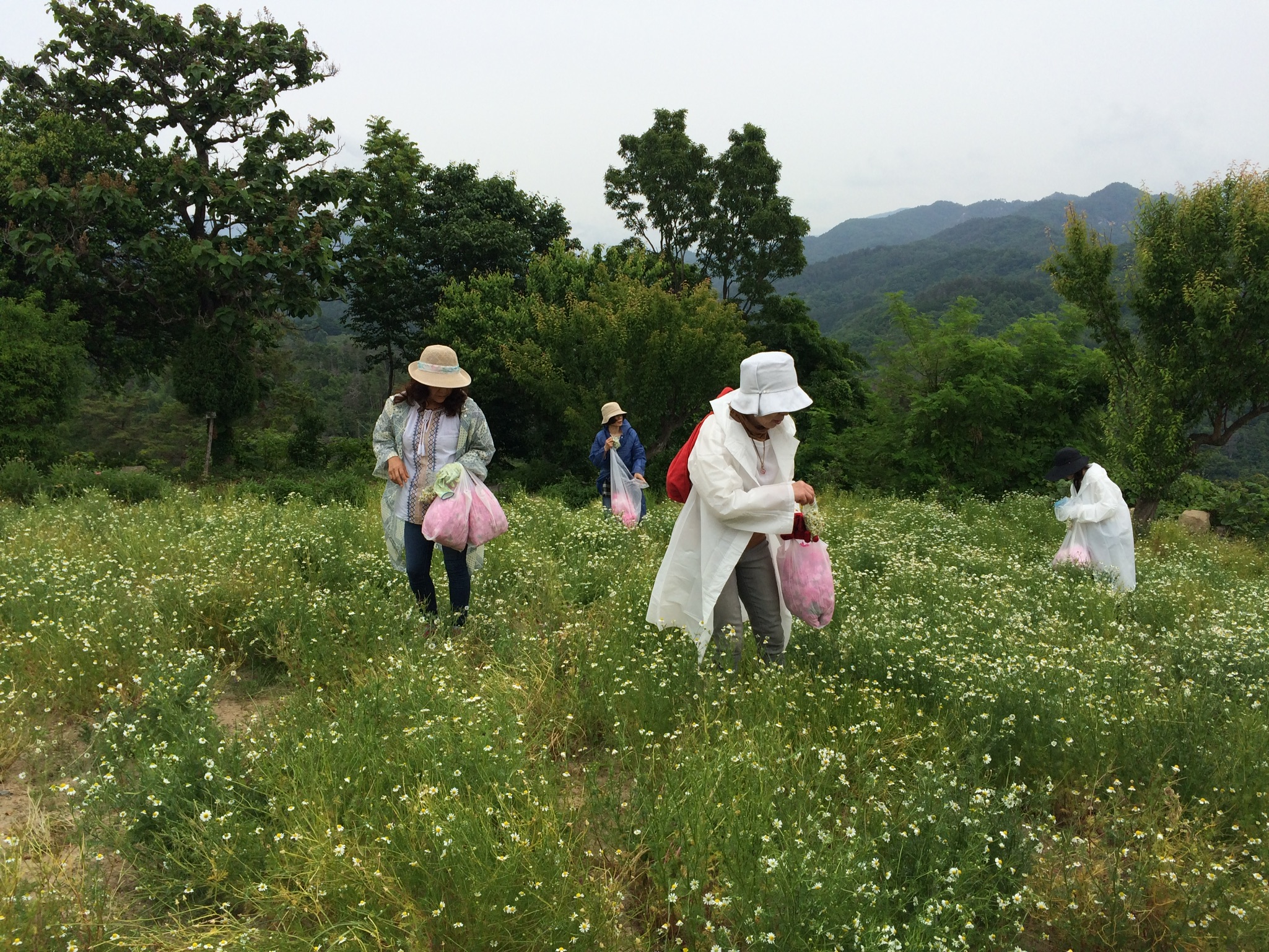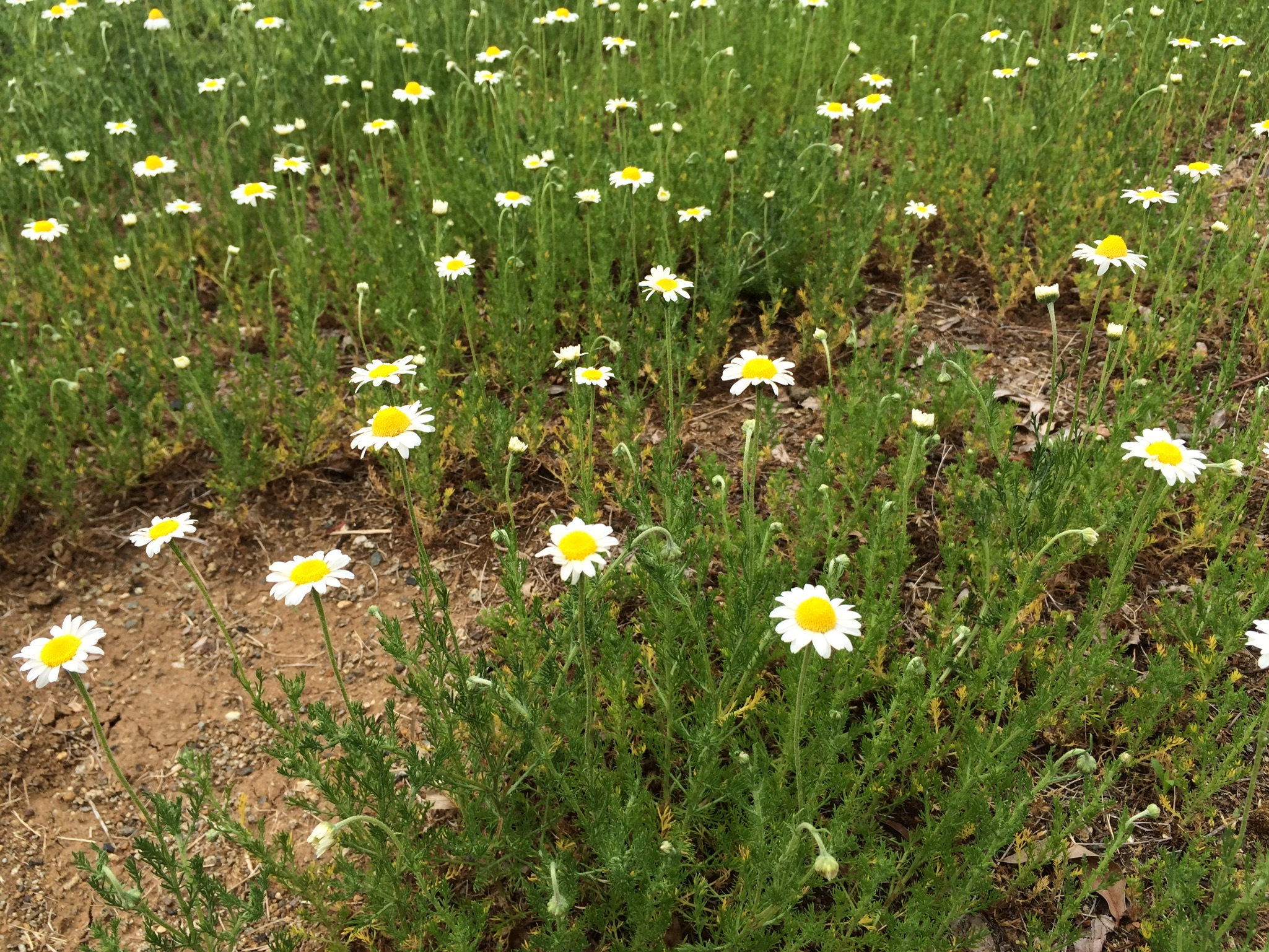 ダマスクローズの畑の隣の「カモマイル・ジャーマンも摘み取りOKです。」との言葉に皆さん反応が早く、ビニール袋にこれまたせっせと詰めました。爽やかなアップルの香りがします。カモミールティーは安眠効果があり癒されます。