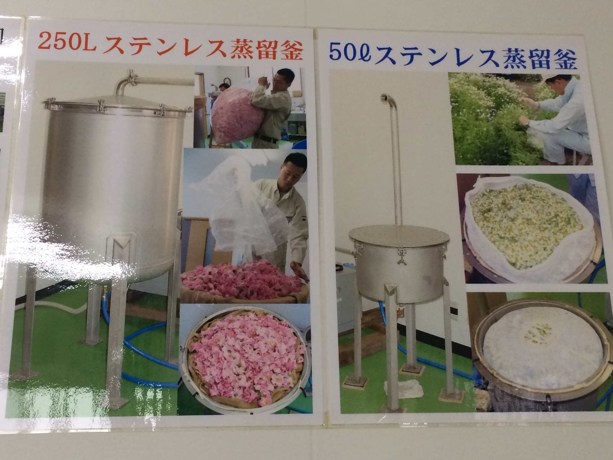 皆さん満足いくまで花摘みをして、袋は花でいっぱいになりました。さて農場から研修所に戻る時間となりました。研修所ではローズの蒸留を見せてくれます。水蒸気蒸留法で精油とウォーターに分けます。蒸留しているところは写真の投稿はNGなのでポスターを載せました。下のビーカーに入った精油とウォーターの写真はローズではなくラベンダーです。