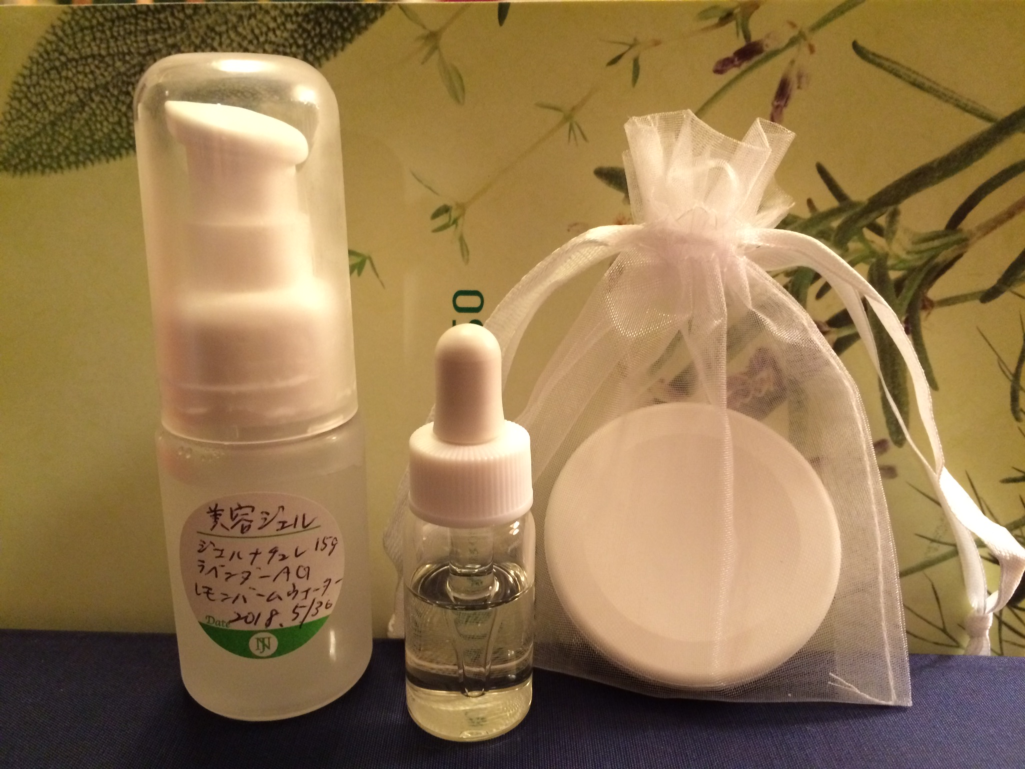 ◎ 美容ジェル プラスチックポンプボトルに中性ジェル基材15gを入れラベンダー精油2滴、ハーブウォーター15㎖を加えてよく振ります。よく混ざったら出来上がり。無添加なので早めに使い切るのがベストです。